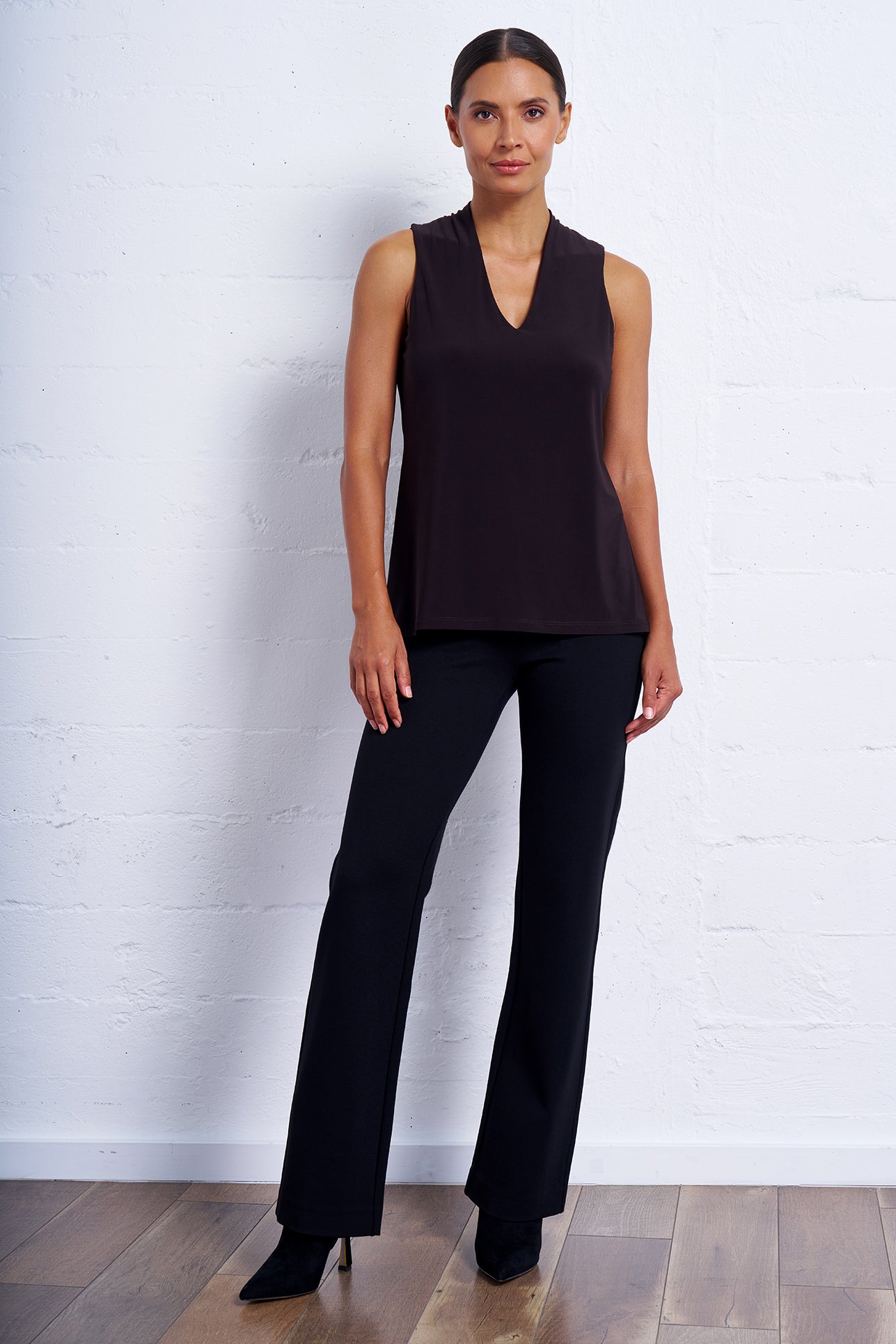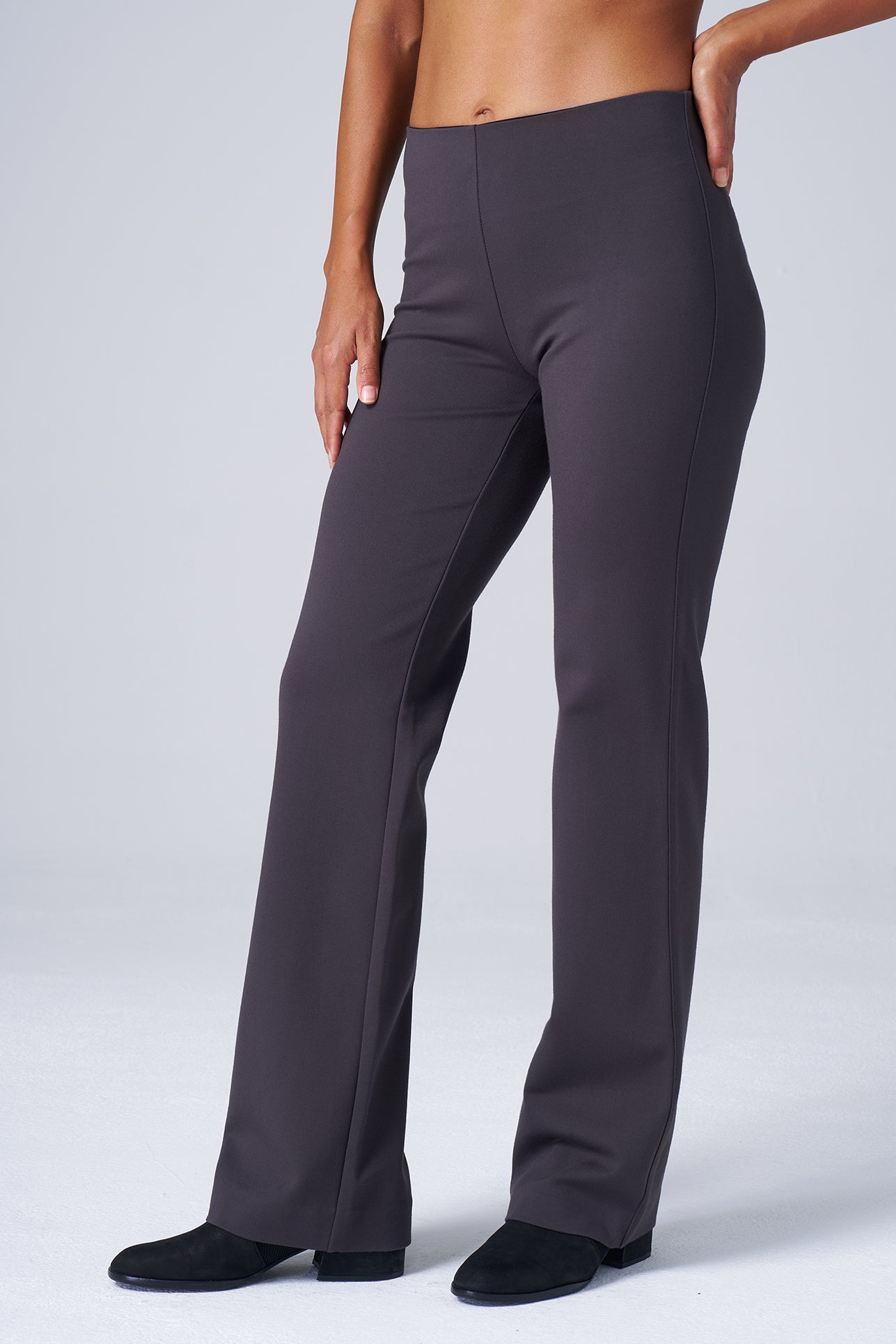 - Elongating bootcut silhouette pairs perfectly with boots or heels.