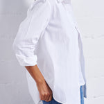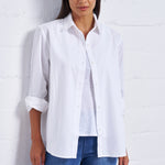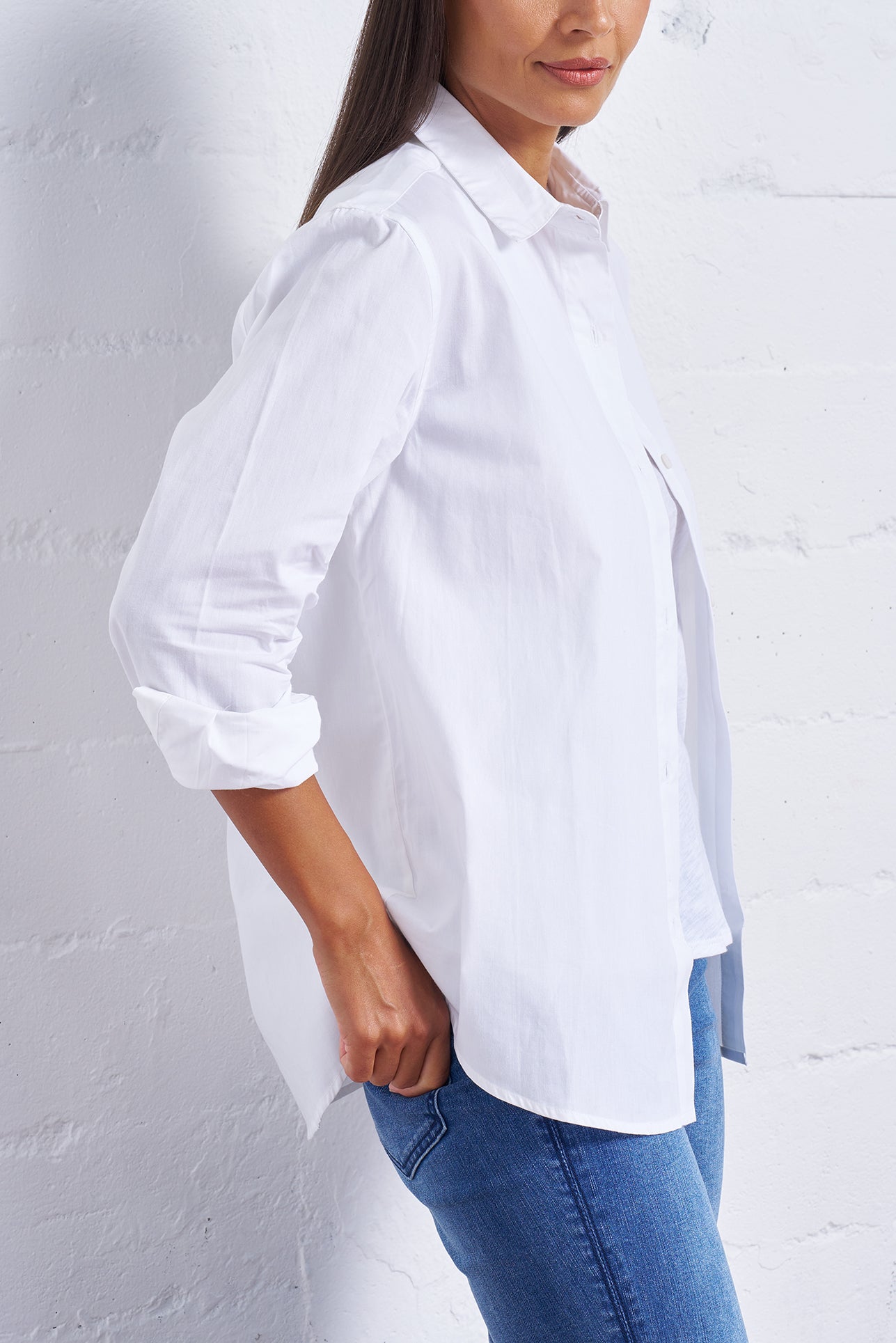 An iconic white shirt, refined. We crafted this crisp cotton button-down with a relaxed, body‑skimming shape and classic details for maximum versatility.