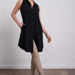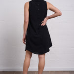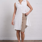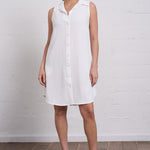 Polished, breathable, and made to move with you, this sleeveless shirt dress is your high-summer hero that easily transitions into early fall. The modern A-line silhouette, full button-back detail, and side pockets make it as functional as it is flattering—wear it solo or layered over pants or under a light cardigan.