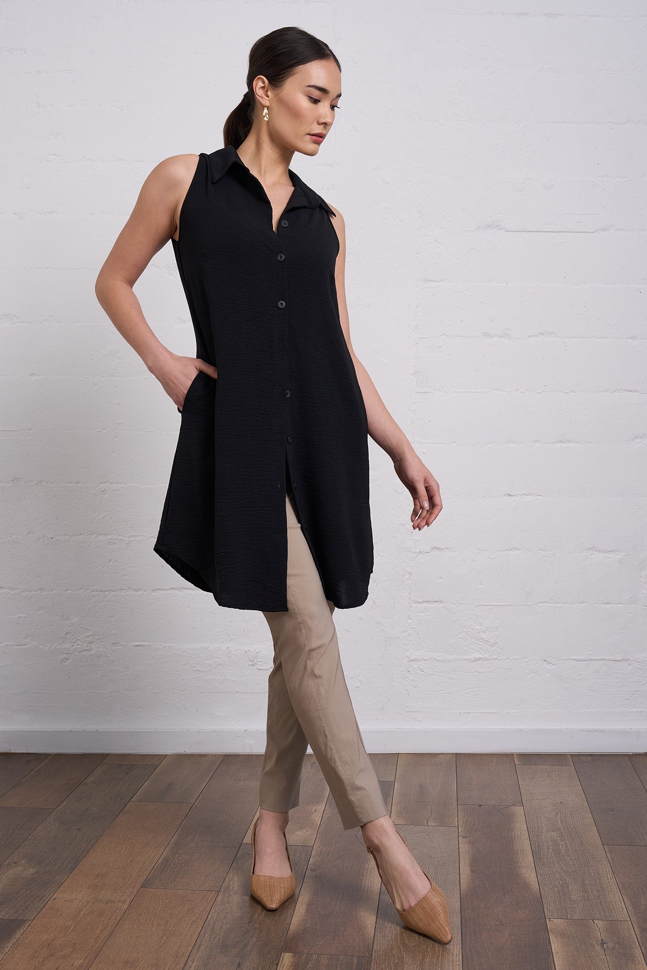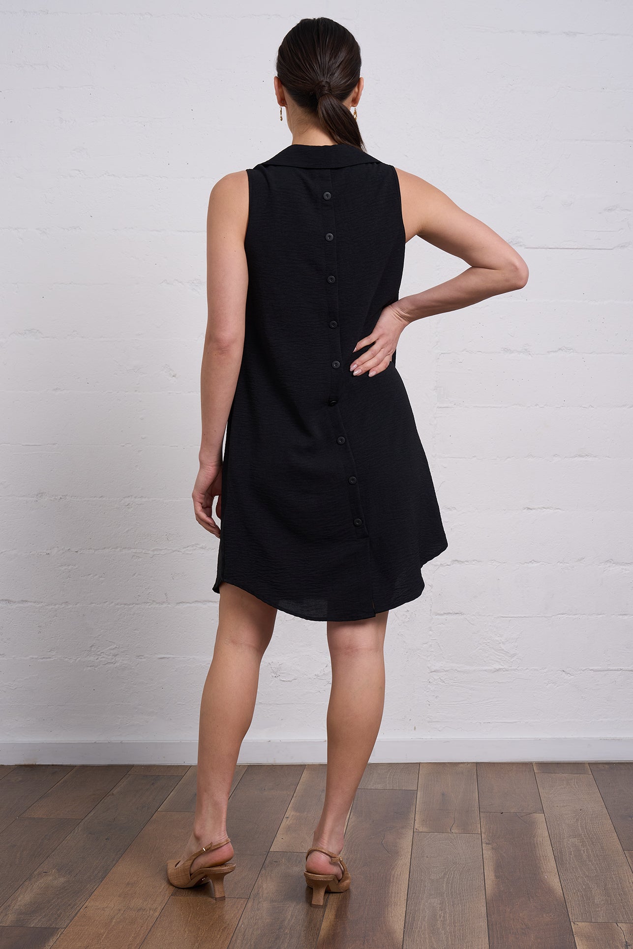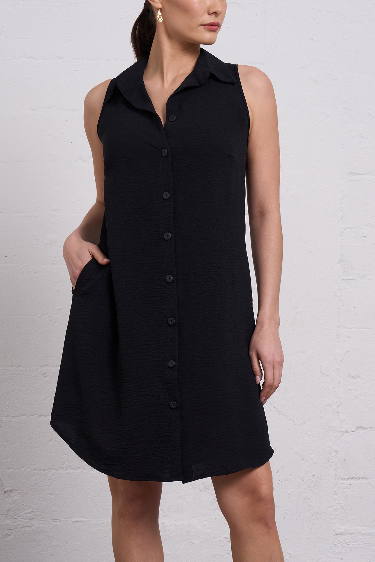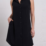 Polished, breathable, and made to move with you, this sleeveless shirt dress is your high-summer hero that easily transitions into early fall. The modern A-line silhouette, full button-back detail, and side pockets make it as functional as it is flattering—wear it solo or layered over pants or under a light cardigan.